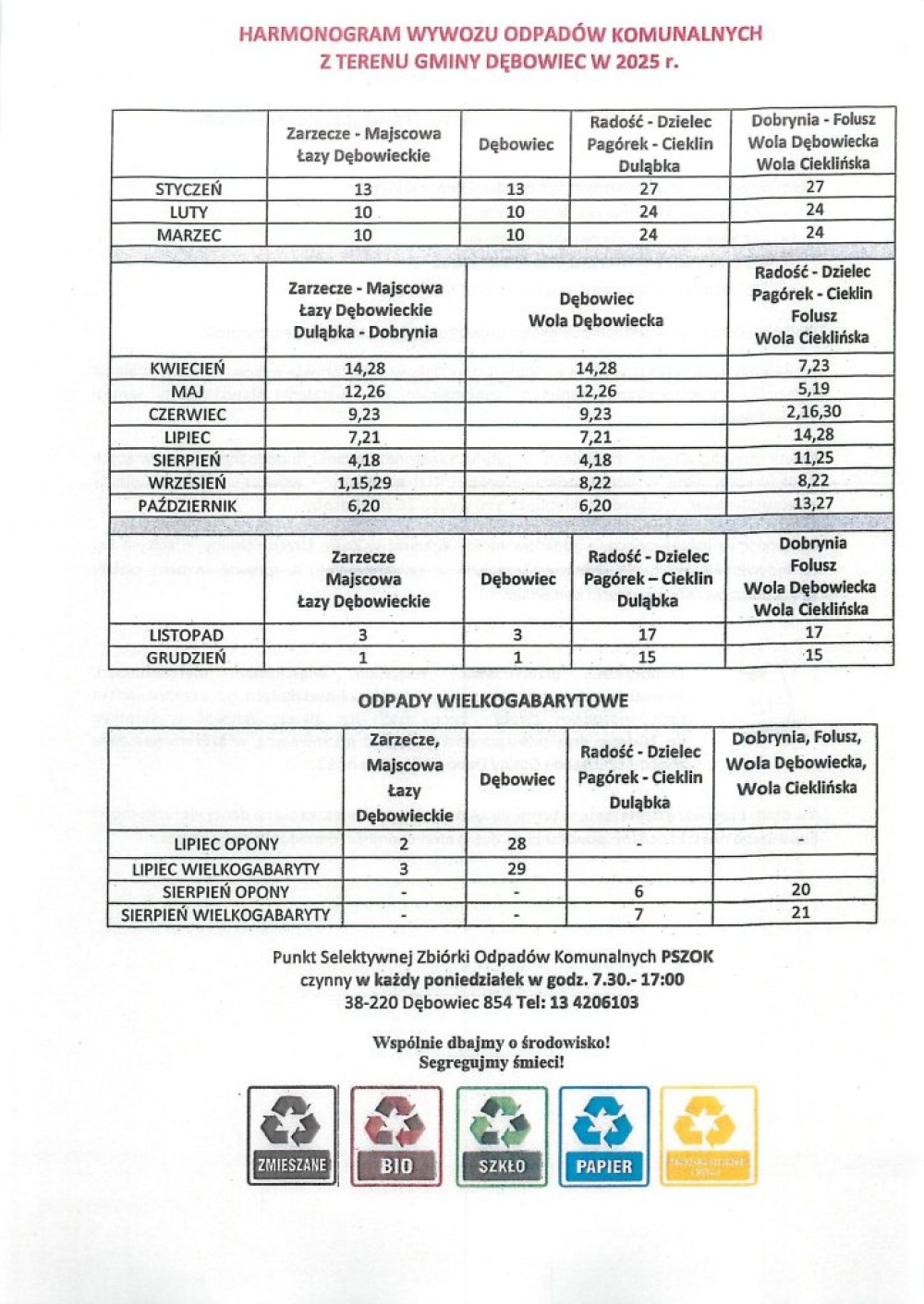 Harmonogram wywozu odpadów komunalnych z terenu Gminy Dębowiec na 2025 r.